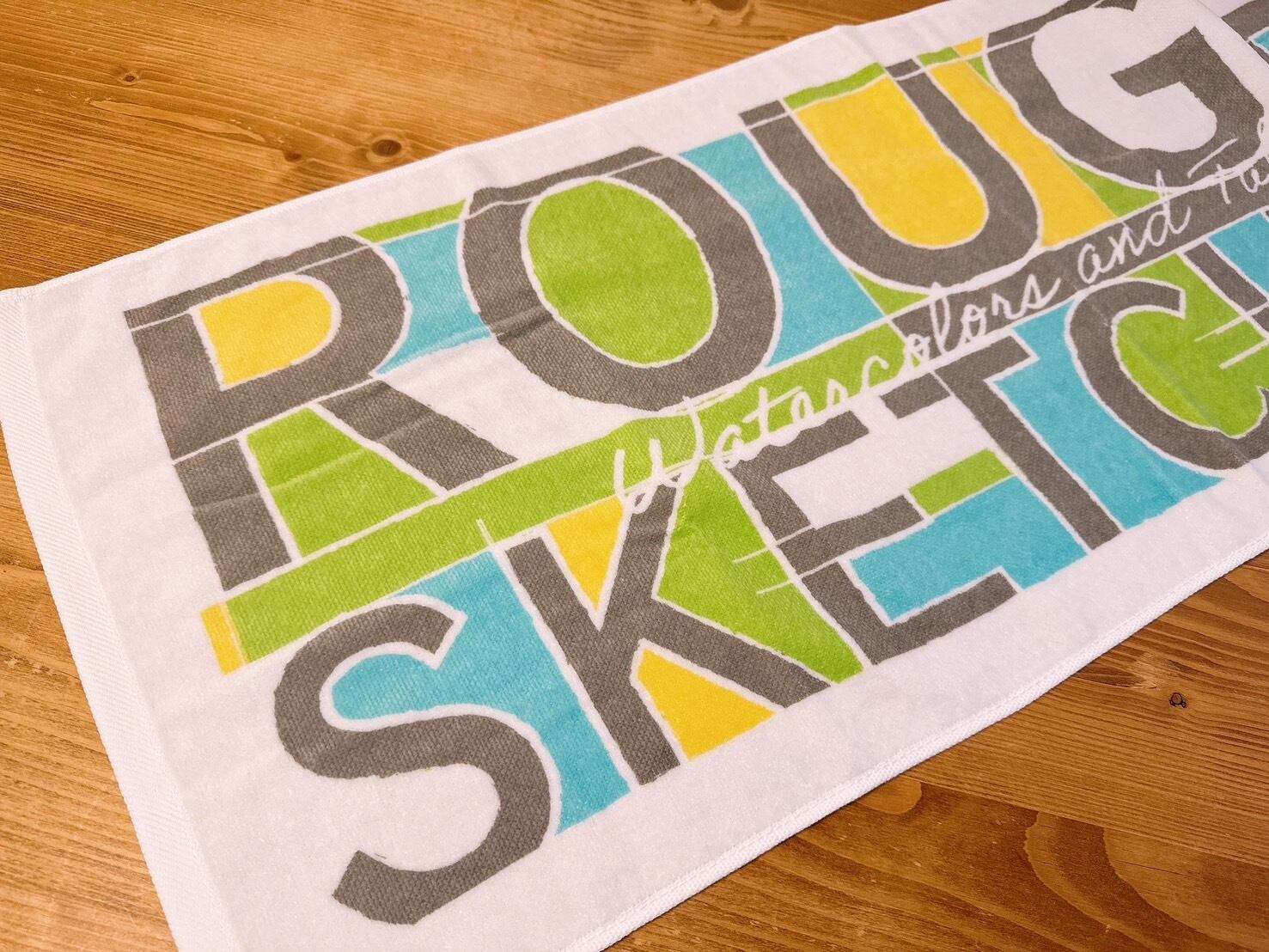 ラフスケッチのロゴがプリントされたタオル。