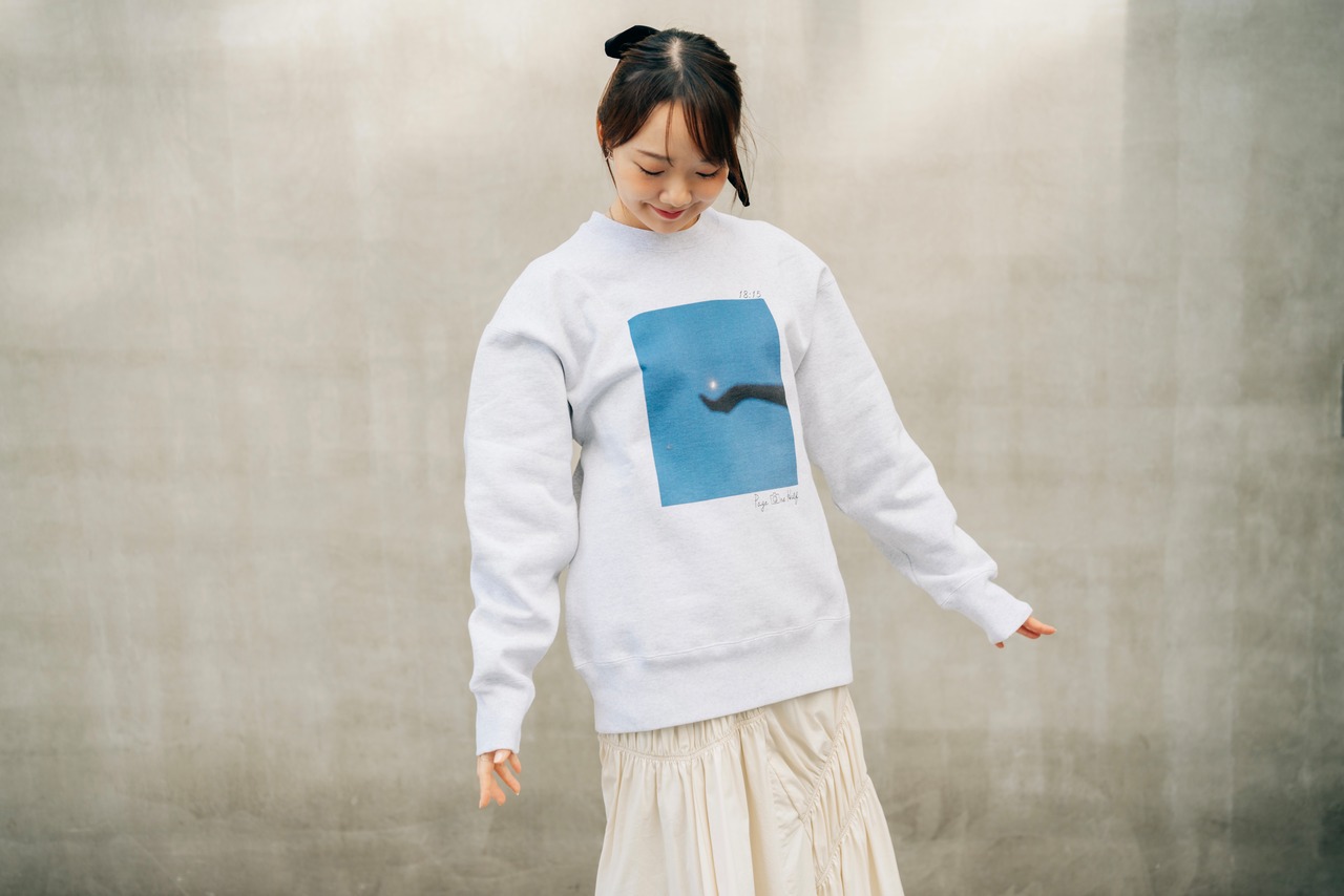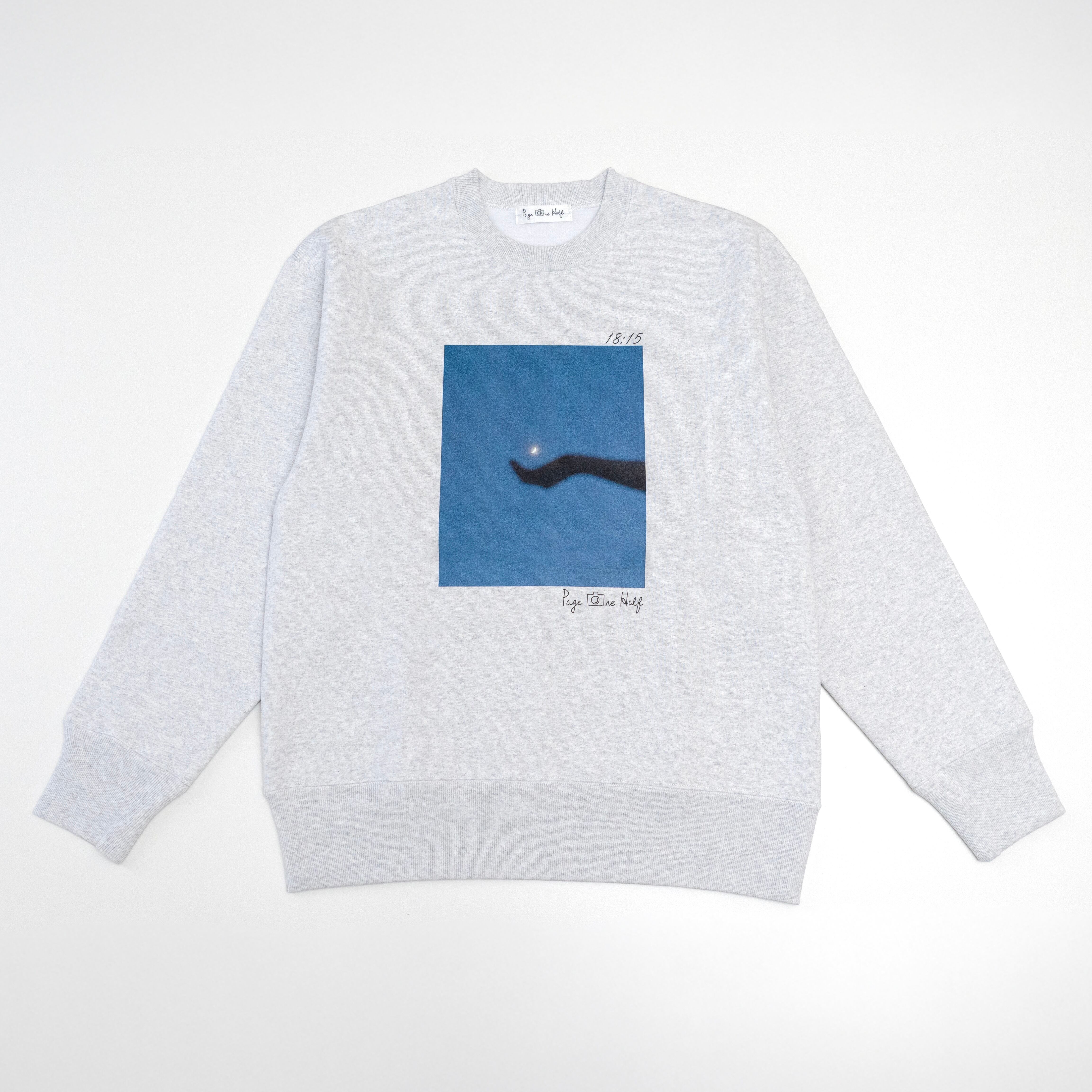 オフホワイトのボディに、印象的な月の写真がプリントされたスウェット。